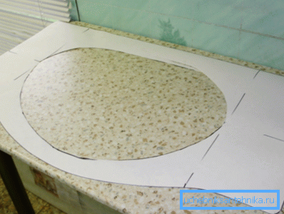 - Перенесите размеры раковины на бумагу в масштабе 1:1. Приложите ее к столешнице, обведите и вырежьте по контуру.