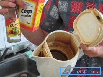 Обратите внимание на то, что для для того чтобы процесса не подойдет теплая вода – нужен лишь кипяток либо приближенная к его температуре влага. Дело в том, что горячей водой будет проблематично смыть пену, которая появится от сотрудничества соды и уксуса.