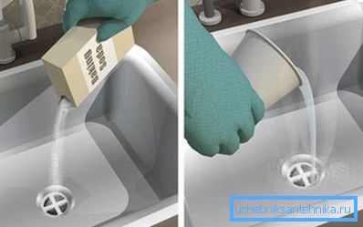 - Необходимо засыпать предельное число сухой соды в сливное отверстие. В большинстве случаев уходит приблизительно добрая половина стандартной пачки вещества.