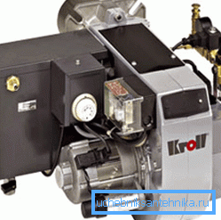 - Котел «Kroll» (Германия) – производится одной из самой популярной компанией, каковые специализируются на оборудовании для промпредприятий. Модель КВ-75 имеет номинальную мощностью 75 кВт/ч. Благодаря применению уникальной горелки KG/UB, которая предварительно разогревает масло, удается взять нужную его вязкость. Ее возможно устанавливать на каждые жидкотопливные котлы, что важно. Для работы нужен сжатый воздушное пространство, исходя из этого нужен компрессор. (См. кроме этого статью Электрокотлы для отопления частного дома: особенности.)