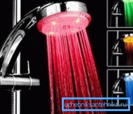 - С подсвечиванием. Уникальность данных устройств содержится в том, что для их полноценного функционирования не нужно подключение к электросети. Установленный в особый генератор за счёт движения водяных потоков снабжает работу встроенных светодиодов. Так, всецело исключается возможность поражения электрическим током. Помимо этого, применение разных цветов по-различному воздействует на людскую восприятие: