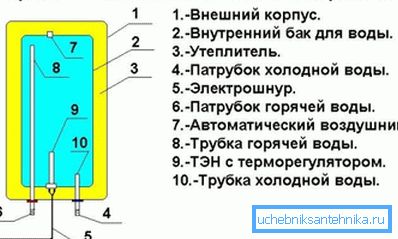 Его корпус - теплоизолированный бак из нержавеющей либо эмалированной тёмной стали. Вовнутрь помещен ТЭН; теплоизоляция двойной стены выполнена полиуретановой пеной.