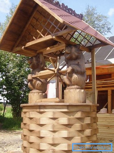 Гармонично в любой ландшафт возможно вписать колодцы, выполненные из натуральной древесины. Их хорошо дополняют надстроенные домики с разными резными фигурами птиц и животных.